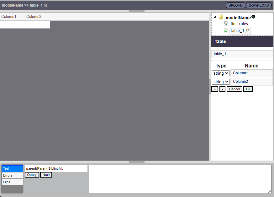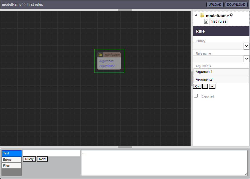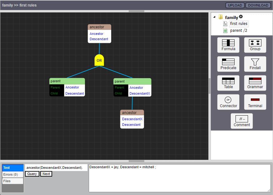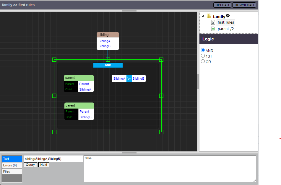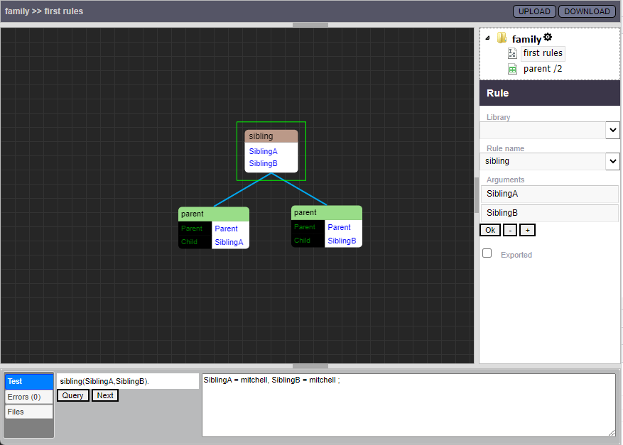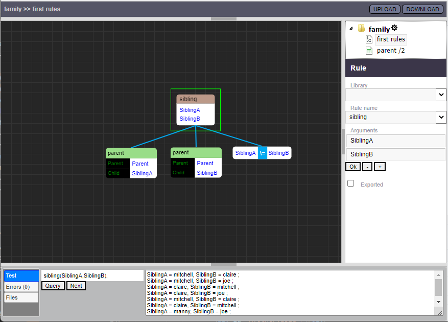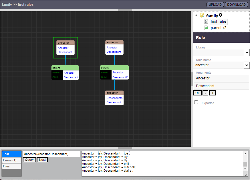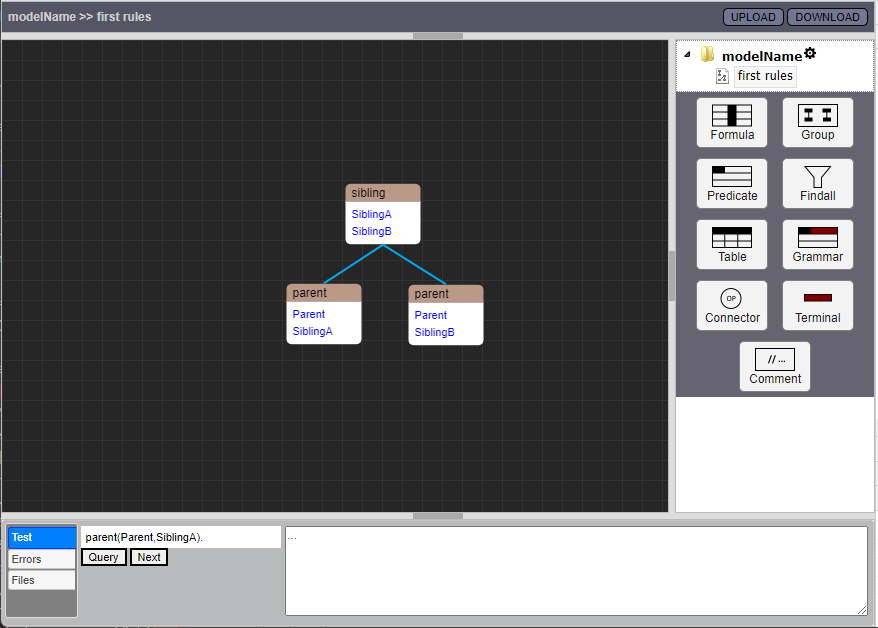 If there are connections going down from a head-shape, those will constitute the body of the rule. In order for a rule head/other node to be true, it is first matched/ checked for truth, and then all the shapes connected to it and under it are recursively queried for truth.