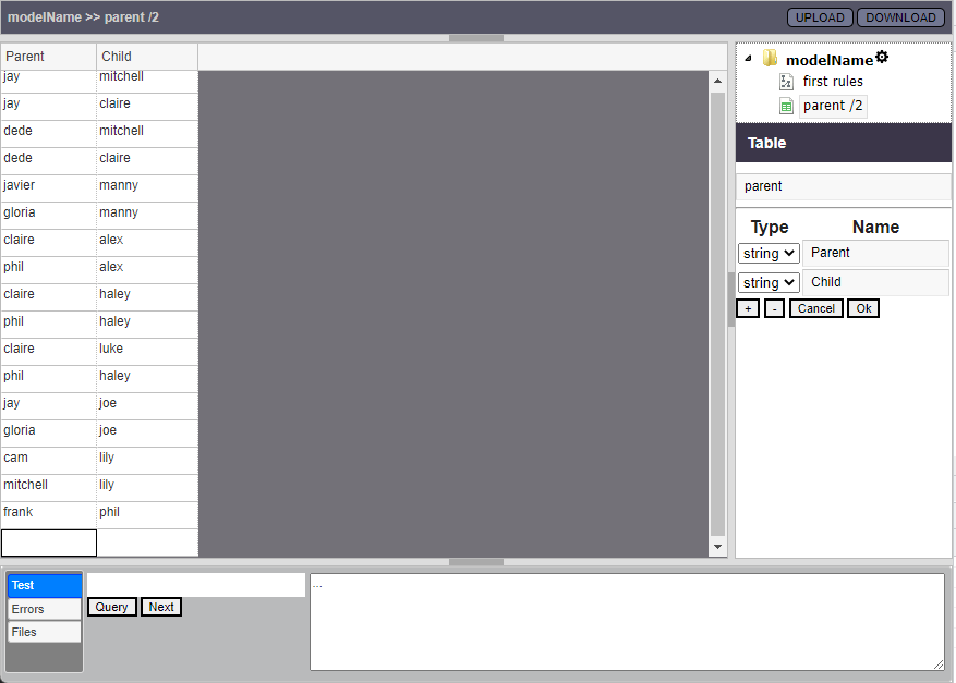 - Visual directed graphs; in this paradigm we could specify the parent/2 -facts with viual entities named “jay” or “mitchell”, having directed parent-connections between them