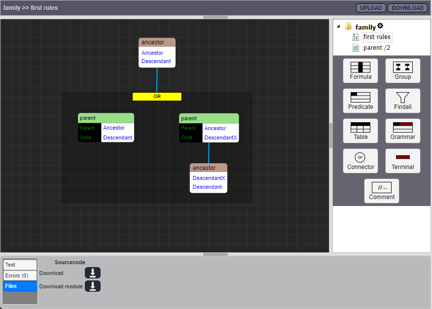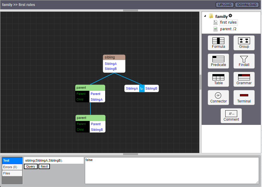 Basic rules in Praxis are constructed like this: A Predicate shape with no incoming connections ( = from above) are seen as the heads of rules.