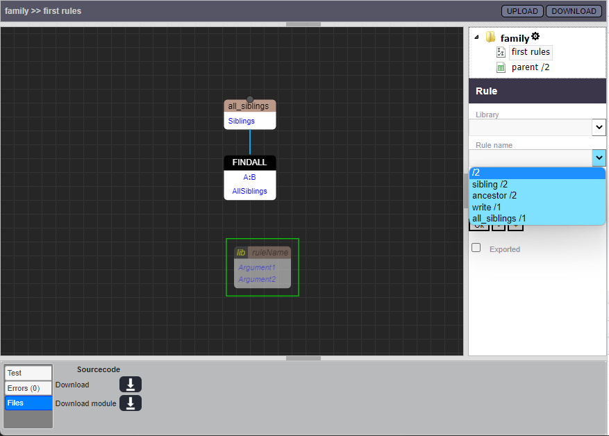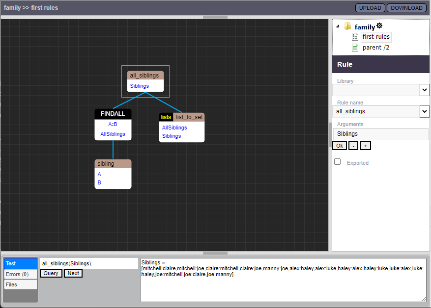 Praxis does its best to be helpful, so it’s remembered that there is a rule named sibling/2, and lets us choose this directly from the rule-name combo.
